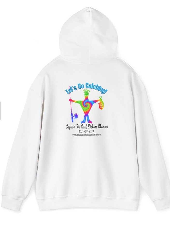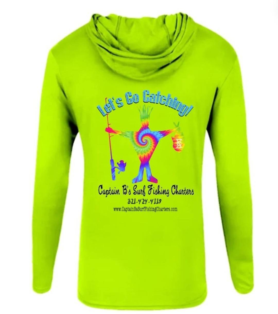 Explore the official apparel of Captain B's Surf Fishing Charters. Our gallery features the high-performance green SPF 50 long sleeve, designed to keep you cool under the bright Florida sun, and our heavy-duty white hooded sweatshirt for those brisk mornings on the sand. Each piece proudly displays our logo and the "Let's Go Catching!" slogan, ensuring you look the part while landing your next catch.